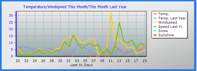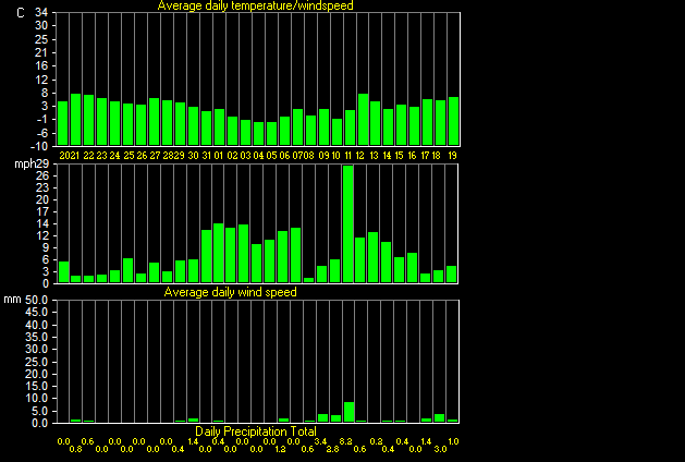 Maximum windspeed = 52.9 mph from 170°( S ) on day 11 at time 19:45