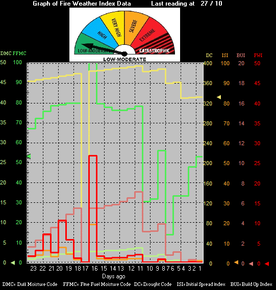Last Updated: 27/10/25 at noon Current Weather conditions TEMP(°C) RH(%) WIND(Km/h) Direction 24 hour rain(mm) 7.9 81 21.1 279 1.8 Yesterdays values FFMC DMC DC ISI BUI FWI 47.9 0 331 0.4 0 0.2 Todays values FFMC DMC DC ISI BUI FWI 53.2 0 332 0.7 0 0.0![]()
